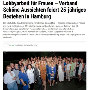 Der bundesweite Unternehmerinnenverband Schöne Aussichten feiert in diesem Jahr sein 25-jähriges Bestehen. Aus diesem Anlass fand im September die Jahresbundeskonferenz in Hamburg statt. Höhepunkte des Netzwerk-Wochenendes waren ein feierlicher Senatsempfang an der Alster und eine Jubiläumsfeier im Übersee-Club. Mehr dazu in business-on.de/hamburg.