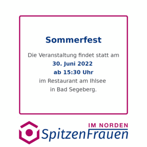 Die Spitzenfrauen im Norden feiern ihr siebenjähriges Bestehen im Rahmen eines Business-Sommerfestes gemeinsam mit Mitgliedsfrauen, Kooperationspartnern und Interessierten aus ganz Schleswig-Holstein am 30. Juni 2022 in Bad Segeberg. Auf dem Programm stehen Netzwerkmeile, Fachvortrag, Worldcafé und jede Menge Austausch.