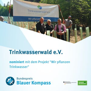 Der gemeinnützige Trinkwasserwald e.V. ist für den Bundespreis „Blauer Kompass“ nominiert – die höchste staatliche Auszeichnung für Projekte zur Anpassung an Klimafolgen. Bis zum 8. Juni 2022 findet unter www.uba.de/tatenbank eine Online-Publikumsabstimmung statt. Der Verein freut sich über eine rege Stimmenabgabe.